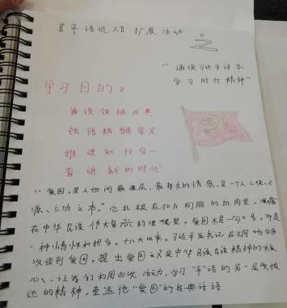 学生第二党支支部全体党员和团支部的部分成员通过深情诵读了习近平总书记爱国经典语录,让爱国主义成为每一个青年的坚定信念和精神依靠。朗读会结束后支部又精心制作了“习近平总书记爱国经典语录”学习活动的感悟手册,纪录了支部对这次活动对爱国主义的情怀。