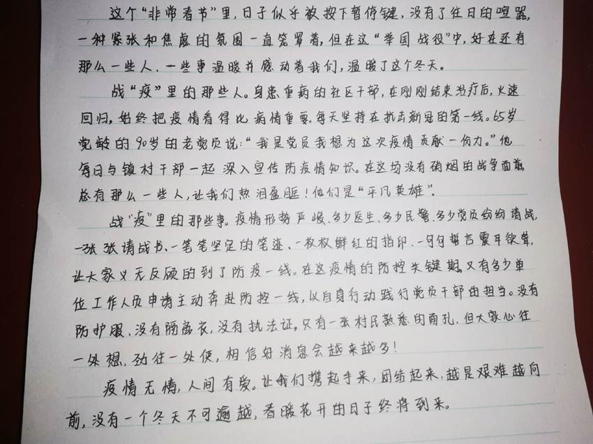 同学们积极响应国家号召,在做好居家隔离的同时认真落实学校“停课不停学”的具体要求,认真开展线上专业课知识学习及雷锋月主题学习活动。为更好地传承雷锋精神,同学们在家中融情于文字,弘扬雷锋的奉献精神、抒发对英雄们在抗击疫情中大无畏精神的敬佩,表达当代大学生共同抗击疫情的决心。韩国a片全体团学干部纷纷拿起手中的笔,化文字为斗争力量,与奋战在一线的英雄们共同抗击疫情。正如同学们文章中所说那样在此次抗击新冠肺炎的战场上,没有人是孤军奋战,惟其14亿中国同胞勇毅、同心,才能势不可挡、战无不胜。