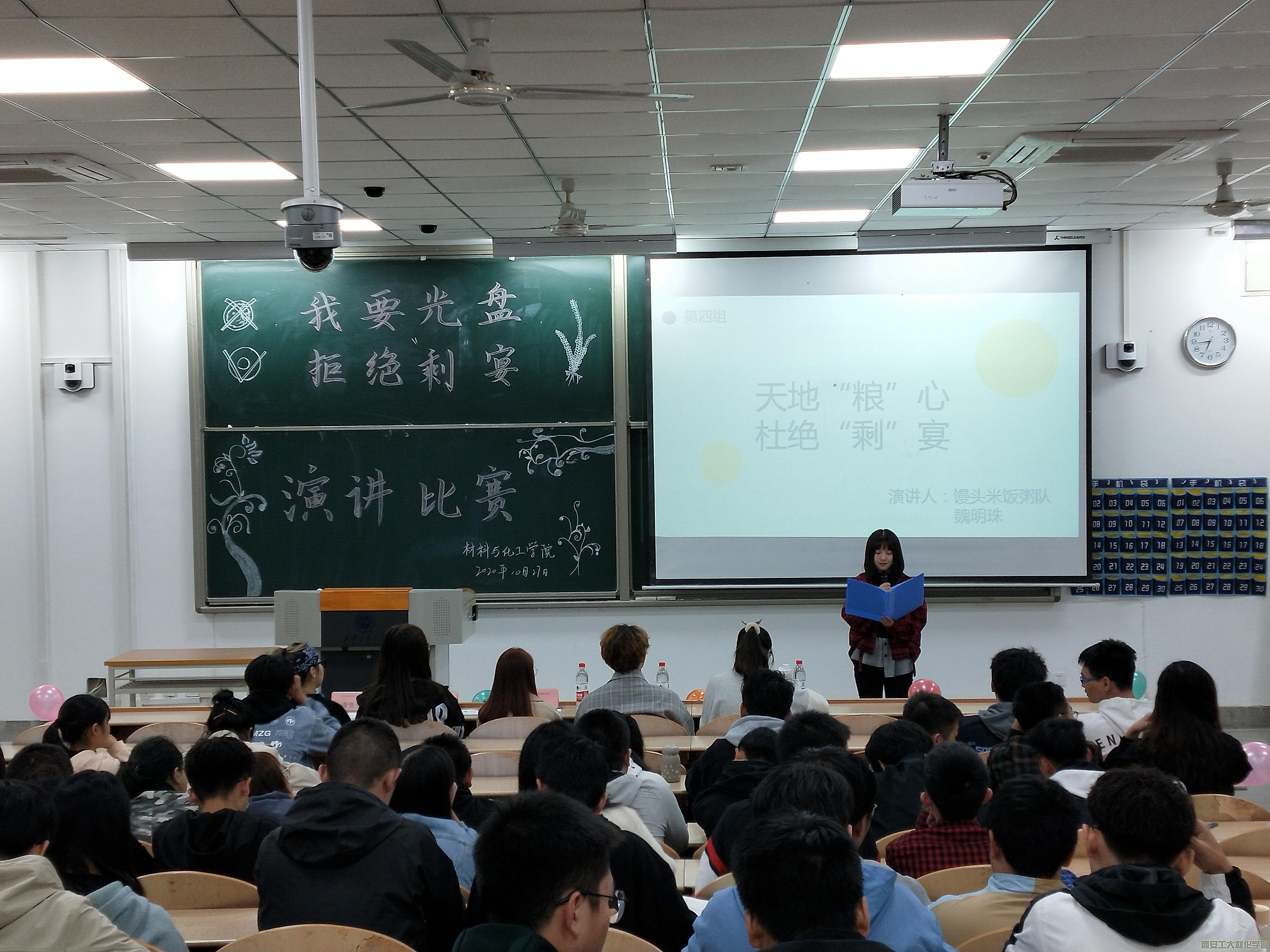 本次活动共有23名选手参加,比赛要求各位选手围绕“光盘”这一主题进行演讲。比赛过程中各位选手都积极踊跃,激情昂扬,演讲内容丰富多彩。选手们分别从光盘行动的由来,身边的浪费现象,光盘行动中我们应该怎样做等方面,进行了阐述,号召大家勤俭节约,反对浪费,充分展现了此次活动的目的。所有的选手演讲完毕并评委打分结束后,学生会干部谭景昱对本次活动进行了总结和点评,并激励同学们在以后的生活中要力行勤俭节约的美德。最后,主持人公布了本次比赛的成绩以及晋级队伍的名单。至此,本次演讲比赛圆满结束。